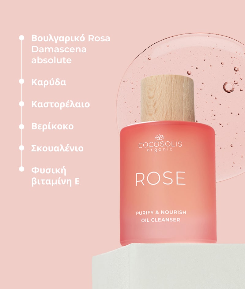 - Απομακρύνει τους ρύπους και το μακιγιάζ και θρέφει το δέρμα σας με το λάδι καθαρισμού COCOSOLIS ROSE Oil Cleanser.